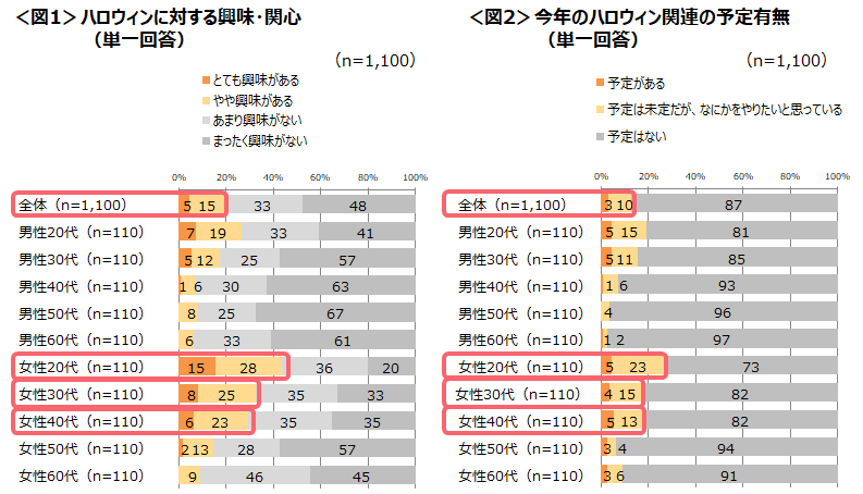 性年代別に見ると、女性の20~40代は比較的ハロウィンへの興味・関心が高く、今年のハロウィン関連で予定がある、あるいは予定は未定だが、なにかをやりたいと思っている人も多い。<図1・図2>