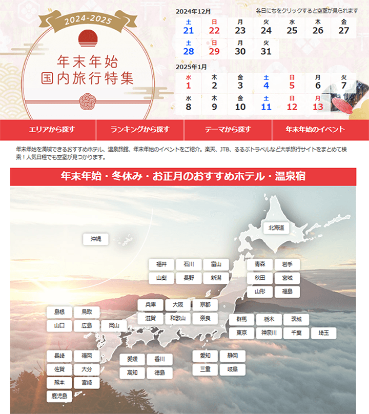 北海道から九州・沖縄までの9つのエリアにおいて、年末年始に人気の宿泊施設を検索できます。