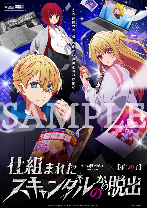 リアル脱出ゲームを企画運営する株式会社SCRAP(所在地:東京都渋谷区、代表者:加藤隆生)は、TVアニメ「【推しの子】」とコラボし、自宅からスマホやアイテムを駆使して【推しの子】の世界に飛び込む、オンラインで遊べるリアル脱出ゲーム『仕組まれたスキャンダルからの脱出』を制作し、2024年7月9日(火)より販売することを発表いたします。