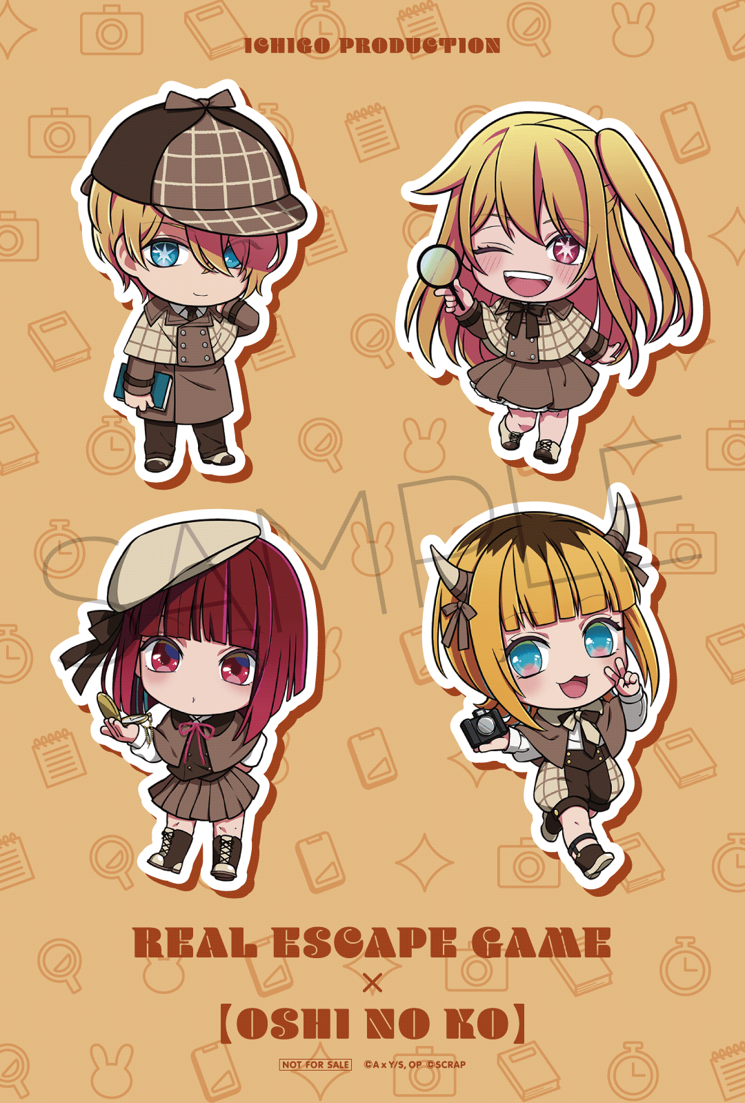 ほかにも、リアル脱出ゲーム×【推しの子】コラボグッズとして、謎解きキットのパッケージとは違う表情の描きおろしイラストを用いたアクア、ルビー、かなのクリアファイルやアクリルスタンドが登場。また、アイやB小町メンバーのほか、アクアやあかねもお揃いの探偵衣装に身を包んだ、星形缶バッジやアクリルキーホルダーをランダム販売! "きゃわ~~~"な"推し"の子を、ぜひ手に入れてください。