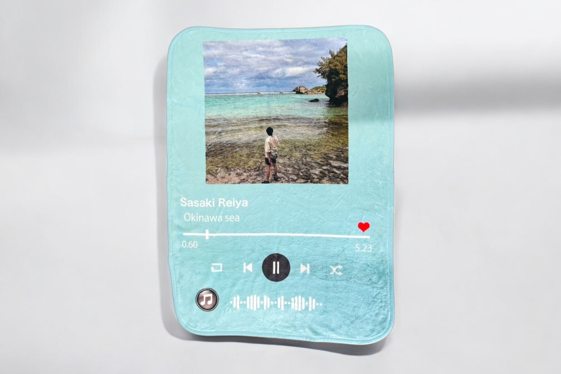 ミュージックプレイ画面ブランケットは、スマホのミュージックプレイ画面をモチーフにしたデザインで、写真の取り込みや名前などお好きな文字を入れることが出来るオリジナルのブランケットです。