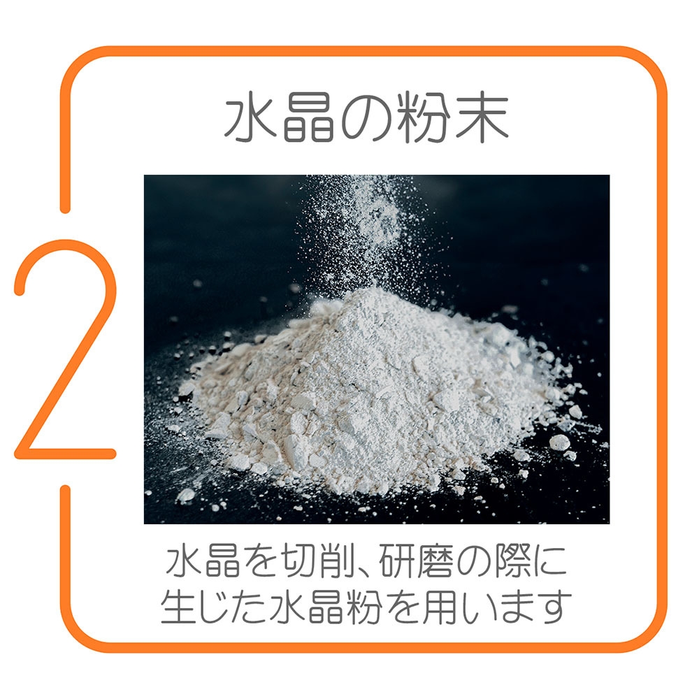 水晶の粉を水に溶かし、上澄みのみを汲み取り沈殿物を捨てる作業を繰り返すことで、不純物を取り除きます。