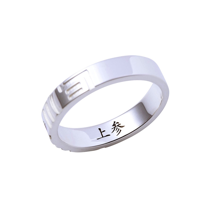 表面には帯と花の模様をモチーフにデザインを取り込み、内側には上弦の陸の「上陸」を黒いぶしで刻印しました。