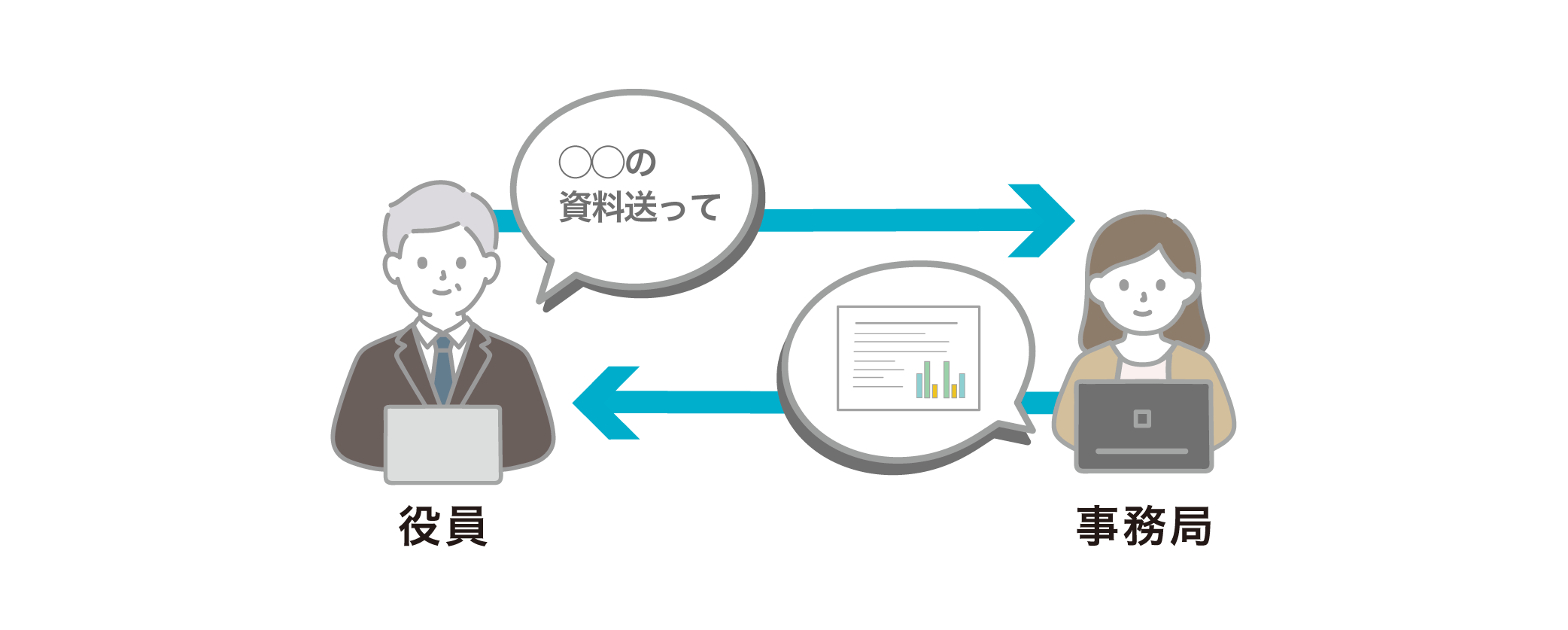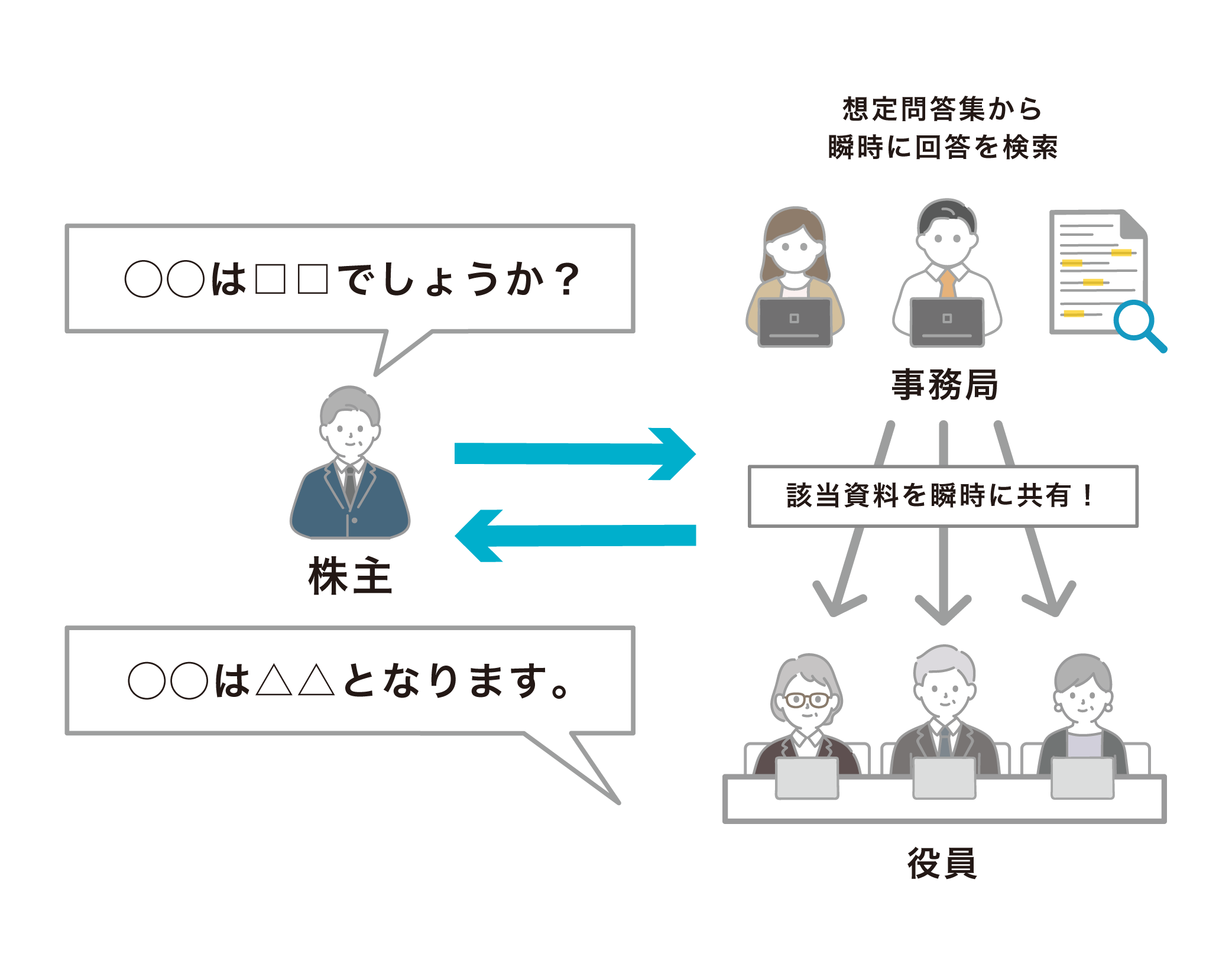 スマートセッションの強力な検索エンジンを利用して株主からの質問も想定問答集から高速に検索、検索後は必要な資料を役員に瞬時に共有でき、役員は共有された資料からスムーズな回答を行うことができます。
