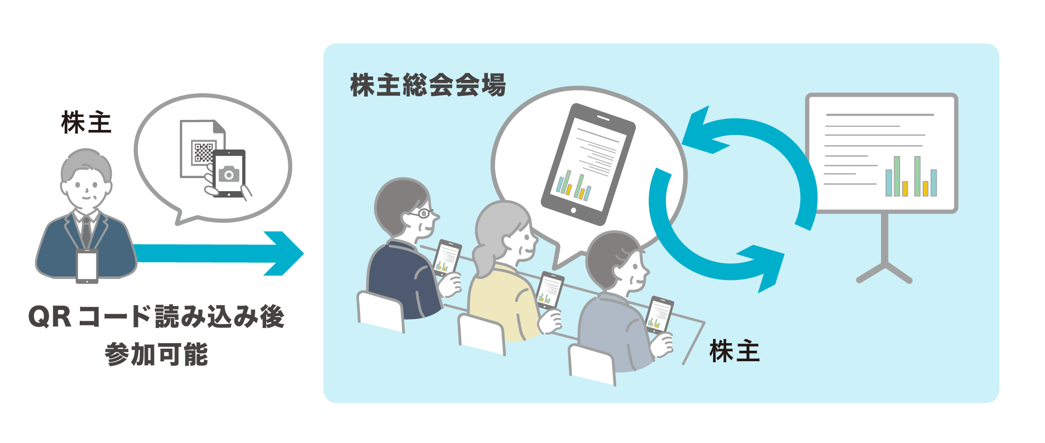 株主等の総会出席者が来場される際、会場に準備したQRコードを読み取ることにより、総会資料を自分のスマホで閲覧することができます。説明資料は手元のスマホで同期されるため、スクリーンから遠い株主にも見やすく資料を共有でき、ホスピタリティを向上させることができます。