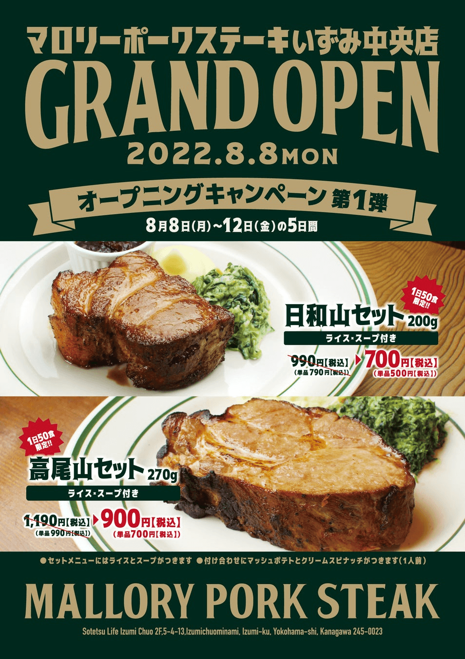 株式会社57(所在地:神奈川県横浜市、代表者 今野健二 取締役 齊藤茂人)が運営する巨大なポークステーキのファストフードをコンセプトにした「マロリーポークステーキ」は6店舗目、初のフランチャイズでの出店となる「マロリーポークステーキ いずみ中央店」を2022年8月8日(月)にオープンいたします(FC加盟オーナー リベラル株式会社)。8月8日(月)〜8月12日(金)の期間は「日和山200g」限定50食を通常790円のところ500円、「高尾山270g」限定50食を通常990円のところ700円でご提供します。