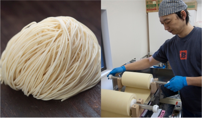 本店のすぐそばにある製麺所で作られる麺は、その日の気温や湿度によって配合を調整し、日々の微妙な変化にも対応しています。