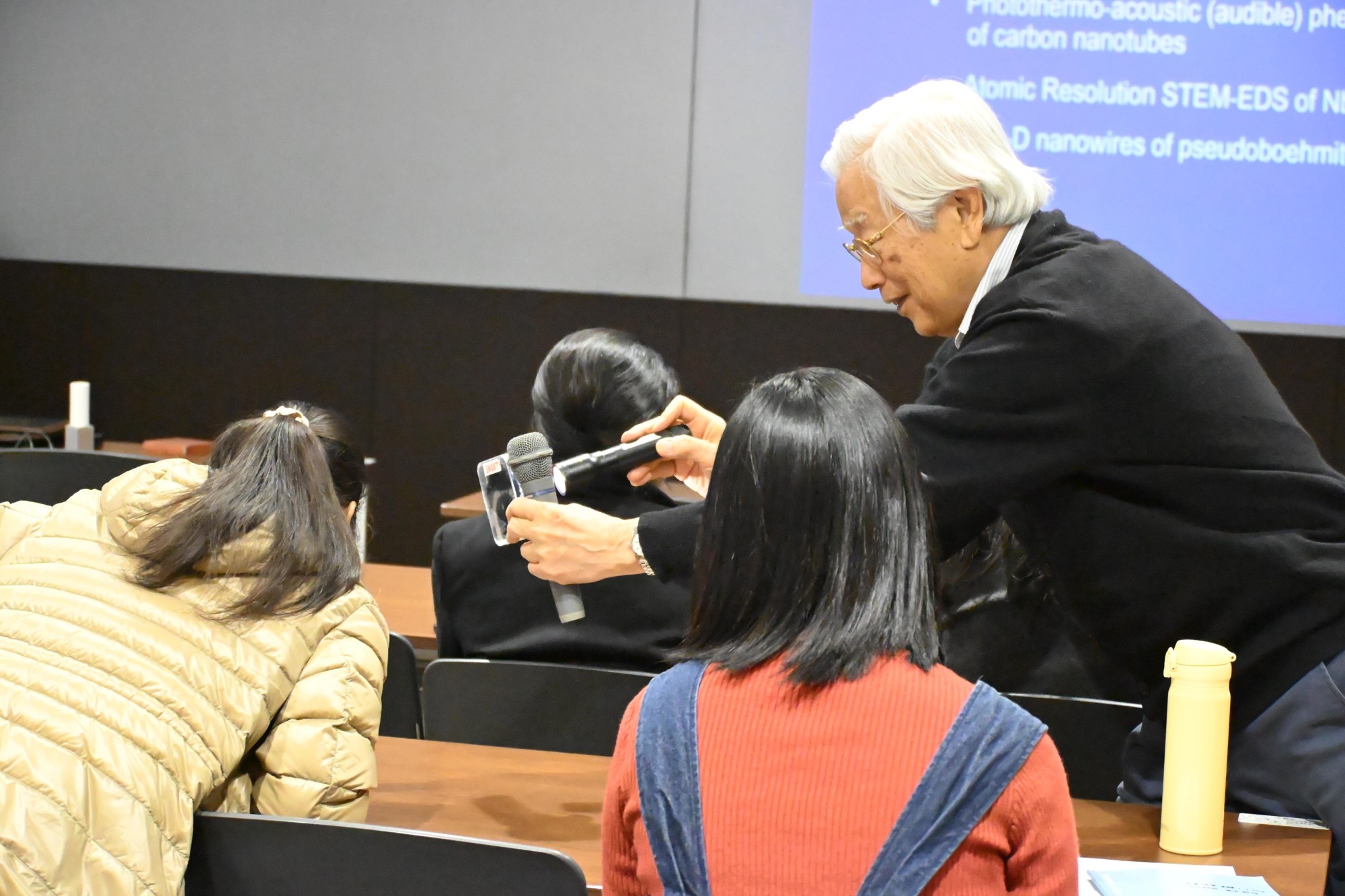 飯島終身教授はCNTの発見に至るまでの研究の歩みを紹介し、CNTに白色LEDの光を当てると音が出る現象を解説。一人ひとりの学生の前で実演もしました。さらに、CNTを用いた応用分野の最新動向などを紹介して、「考えることをやめたら発見することはできない」と研究者としての心構えも説きました。