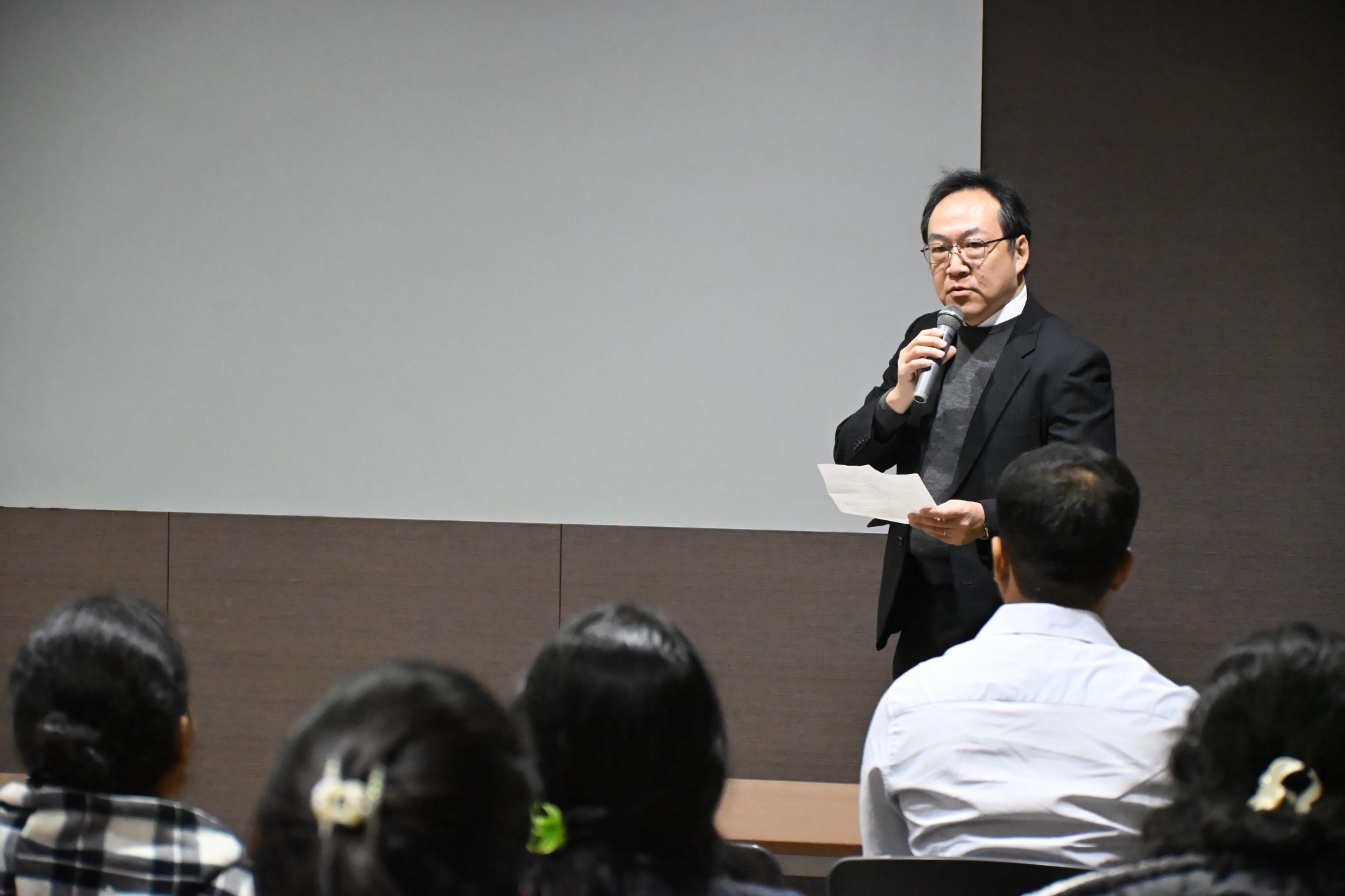 滞在初日の12日には研究実験棟Ⅱで歓迎セレモニーが行われ、理工学部応用化学科の中村忠司学科長は、本学の概要について述べたあと、「研究を深め、日本文化も味わい、この滞在を充実したものにしてほしい」と緊張気味の学生たちに語りかけるように歓迎のあいさつをしました。受け入れ責任者を務めるナノマテリアル研究センター長の丸山隆浩教授からは、「インド出身で博士課程に在籍する学生もいます。デンプ人文科学大学からの訪問は今回で3回目。交流を継続でき、皆さんをお迎えできることは非常にうれしい」との話がありました。