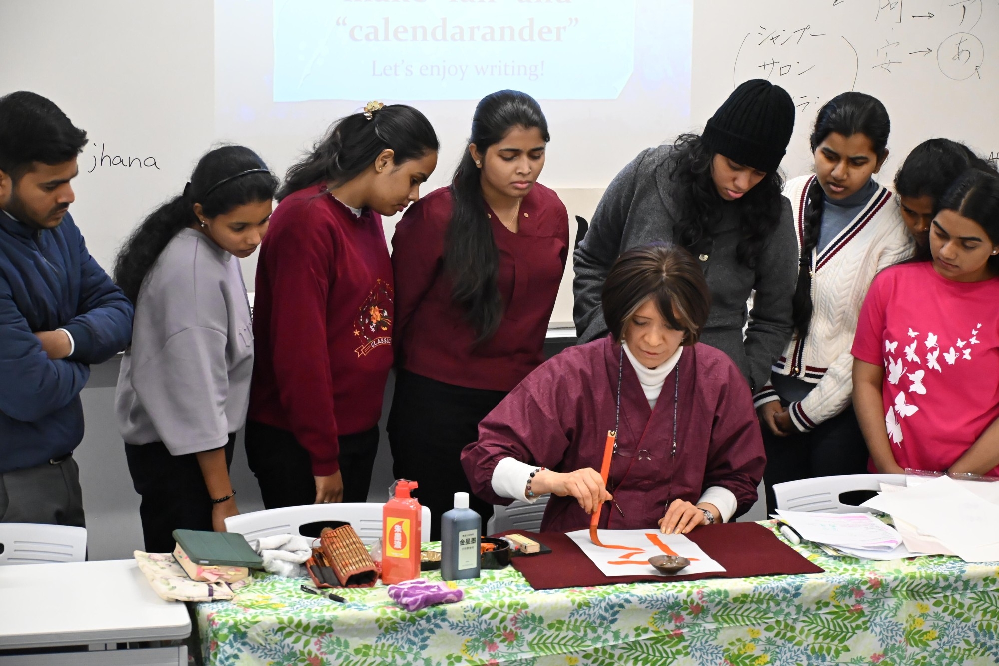 初めて筆を持つ学生たちは、筆の弾力や選んだ文字の筆順を確かめながら練習し、うちわやカレンダーへの清書を行いました。名前を入れるとすてきな「お土産」が完成。最後に各自が選んだ文字への思いについて、「『日本』が好きだから選びました」「日本は美しいから『美』にしました」「『絆』は難しい字です」などと伝え合い、日本の書や文化を味わいました。