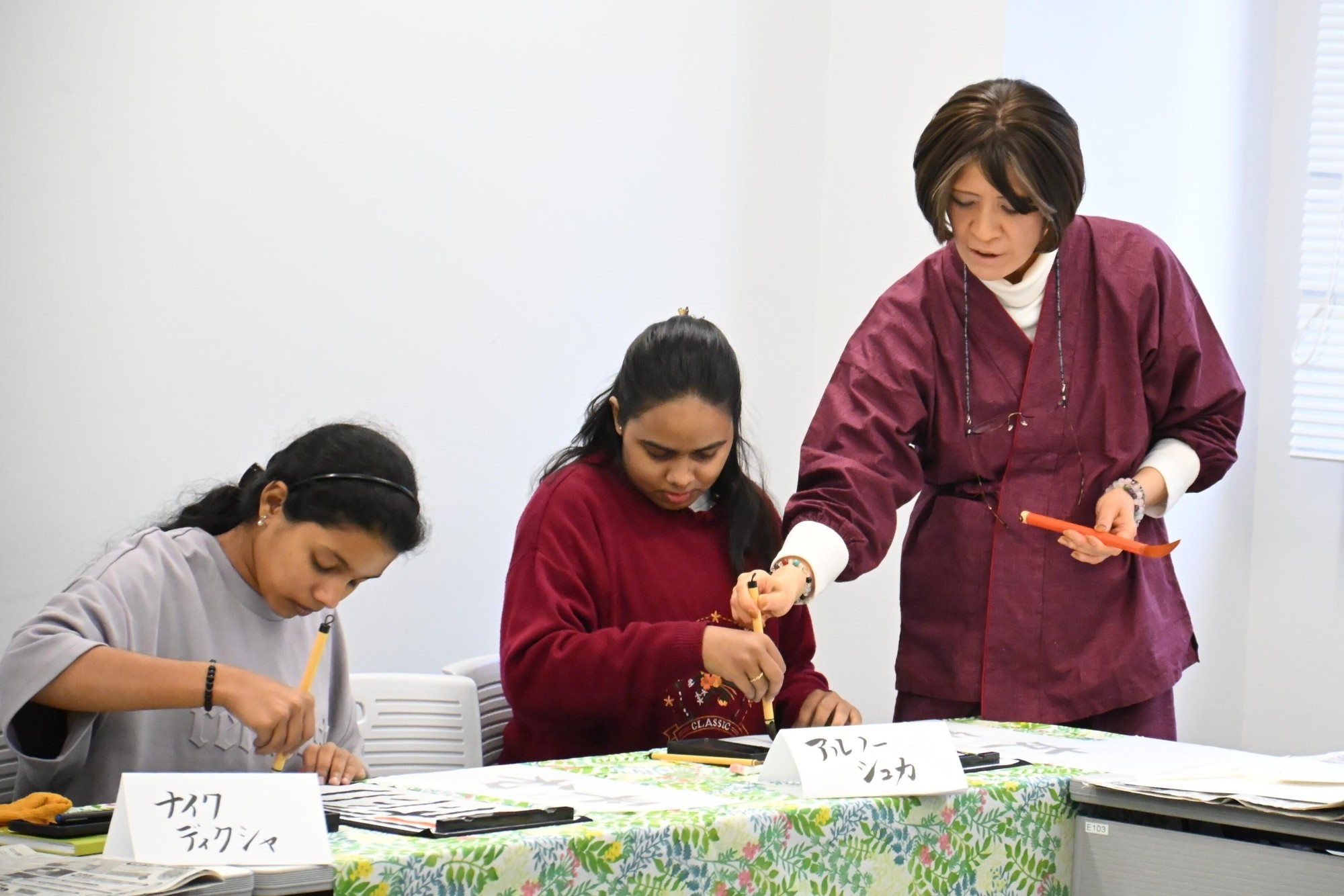 12日には、日本文化にふれることを目的に書道の体験を行いました。講師は市内の「スミレ書道教室」を主宰する稲原里映さん。学生たちはまず、稲原さんとアシスタントの中森美結さんから書体の種類やひらがな、カタカナの成り立ちなど、日本の文字の歴史についての説明を受け、筆の持ち方や運筆の仕方を学んだ後、用意された「友」「日本」「平和」などの中から好きな言葉を選んで練習を開始。