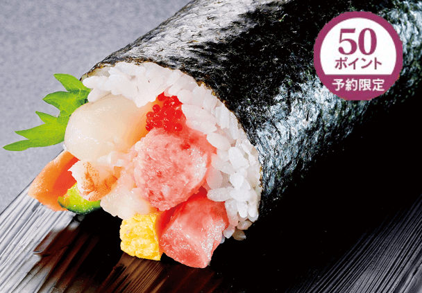 北海道産帆立や伊勢黒潮まだい・ずわいがに・数の子などバイヤーが厳選した8種類の具材が入った極太太巻。