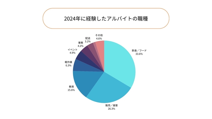 ●学生が2024年に経験したアルバイトの職種は「飲食/フード」が最多で33.6%。次いで「販売/接客/サービス」が26.3%と上位2職種で過半数超え。
