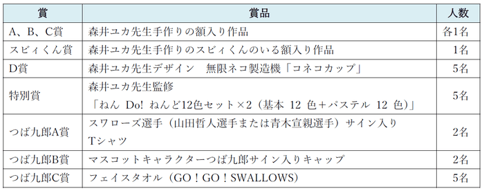 受賞者には森井ユカ先生手作り作品や東京ヤクルトスワローズ選手のサイン入りグッズなどをプレゼント