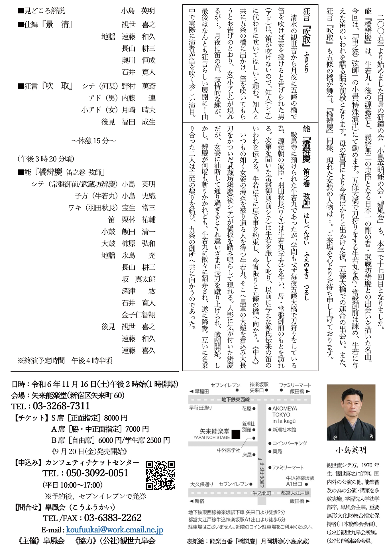 皐風会主催、小島英明 能の会 第17回 碧風会『橋辨慶』 が2024年11月16日 (土) に矢来能楽堂(東京都 新宿区 矢来町 60)にて上演されます。