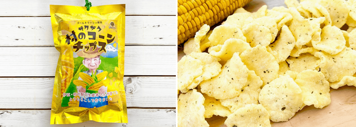 地元生産者さんのとうもろこしをパウダーにして、ザクザクのコーンチップスを作りました。とうもろこしの甘さたっぷり感じるコーンポタージュ味に仕上げました。おやつやお土産にぴったりのやみつきになるお菓子です。今後も村のコーン関連商品や関連メニューを続々とリリースいたします。