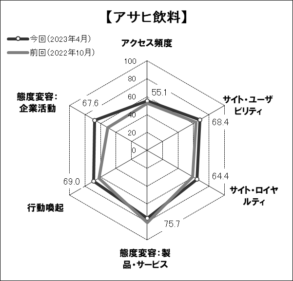 「アサヒ飲料」は、一般企業サイト内順位が前回第17位から上昇し、初の首位を獲得した。500サイトでの全体順位は第6位となった。WBIは前回のスコアから8.0ポイント増の74.6ポイントだった(図表2)。個別の指標では、「態度変容:企業活動」が16.9ポイント増と大幅に上昇し、67.6ポイントの高評価を獲得した(図表3)。トップページのリニューアルに伴い、キービジュアルで「100年のワクワクと笑顔を。」というメッセージを押し出したり、商品情報だけでなく、CSV(Creating Shared Value:共有価値の創造)の取り組みを伝えるコンテンツへの導線を拡充したりするなど、企業としての姿勢や活動が伝わる情報発信が評価の上昇につながった。