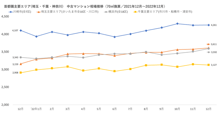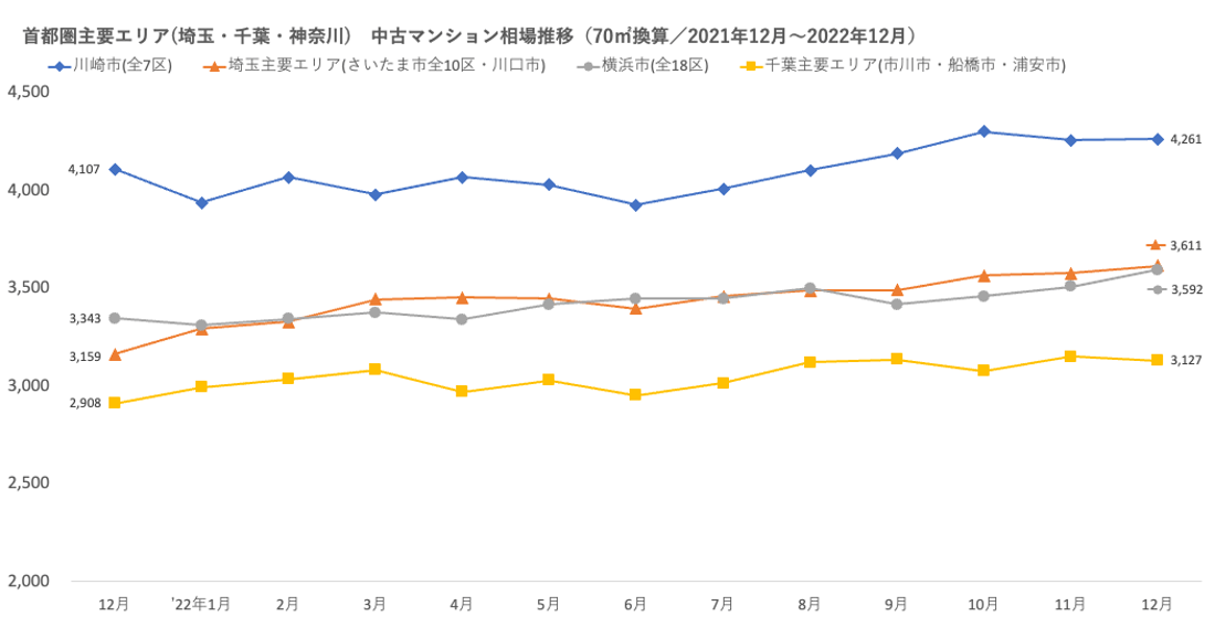 ■首都圏主要エリア 中古マンション相場推移(2021年12月~2022年12月)