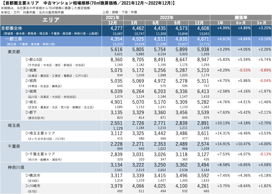 「マンションレビュー」2022年12月 全国主要エリア/47都道府県 中古マンション相場推移を発表