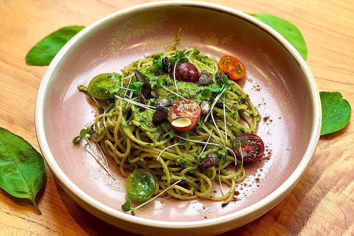 豆だけでできたグルテンフリーの「ZENBヌードル」に、爽やかなバジルの香りとナッツのコクが広がる特製グリーンソースをたっぷり絡めました。ニュートリショナルイースト(チーズのようなコクがある栄養酵母)の旨みやレモンの酸味がアクセントとなり、最後まで飽きずに楽しめる一皿です。仕上げにローストパンプキンシードの香ばしさ、ミニトマトの彩りと食感を添え、見た目も味も満足感たっぷり。暑い季節にもぴったりの、ヘルシーで食べごたえのあるパスタです。