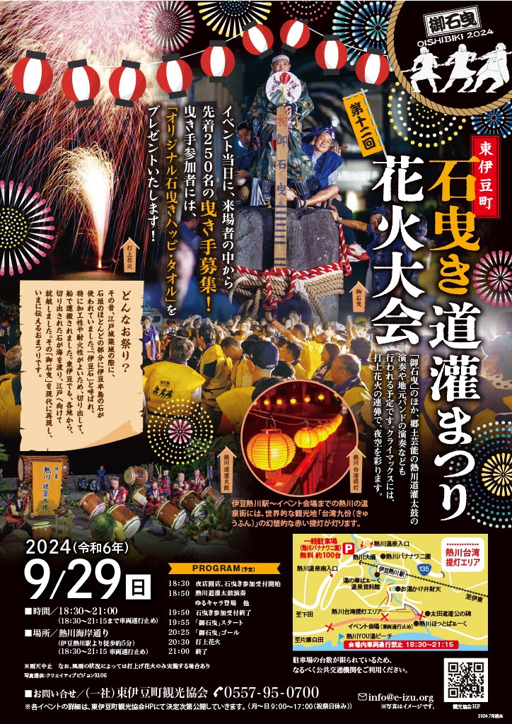 石曳道灌まつり花火大会では夜の熱川温泉の海岸通りにて江戸城の石垣にも使われた12tもの重さの伊豆石を祭りの参加者で運び出す祭典となっています。