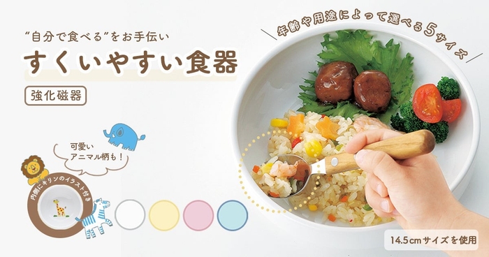 この食器は、内側に返しのあることですくいやすく設計されているため、子どもの「自分で食べたい!」という気持ちを応援してくれます。