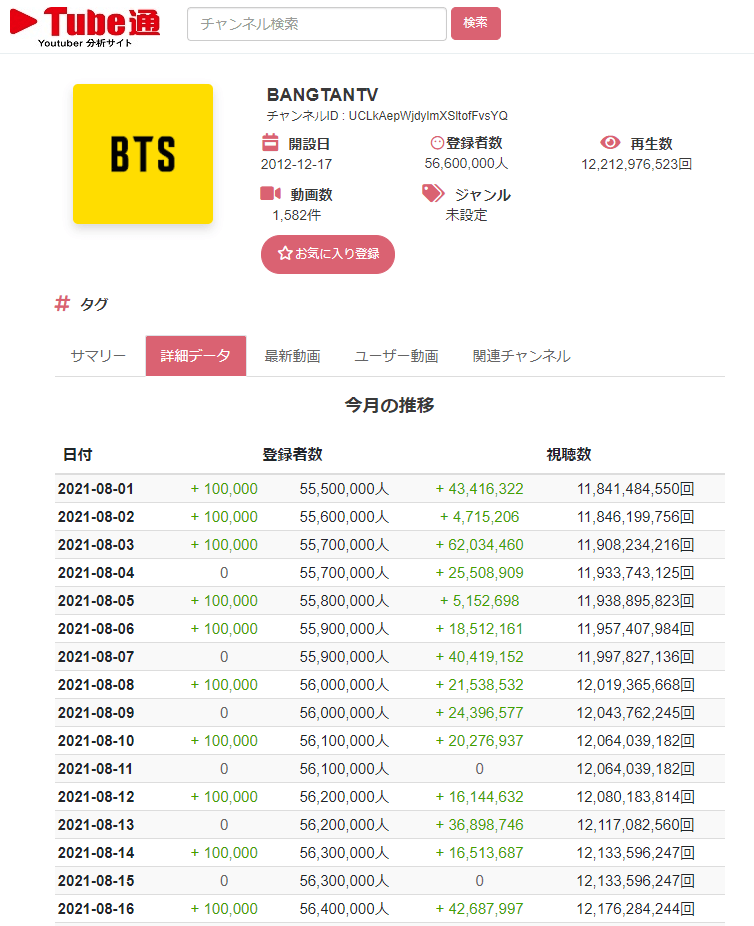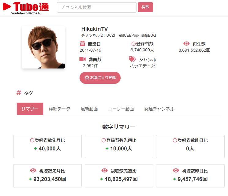 Tube通では、誰でも無料で自由に日本国内のYouTubeのチャンネルを登録・推薦でき、それぞれの登録者数や再生回数、動画数などを総合的に判断した人気YouTubeチャンネルランキングを表示しています。チャンネルの詳細ページでは、毎日最新のデータをYoutubeAPIを使って取得し、1ヵ月間の登録者数の推移や視聴者数の推移をグラフを使って可視化しています。