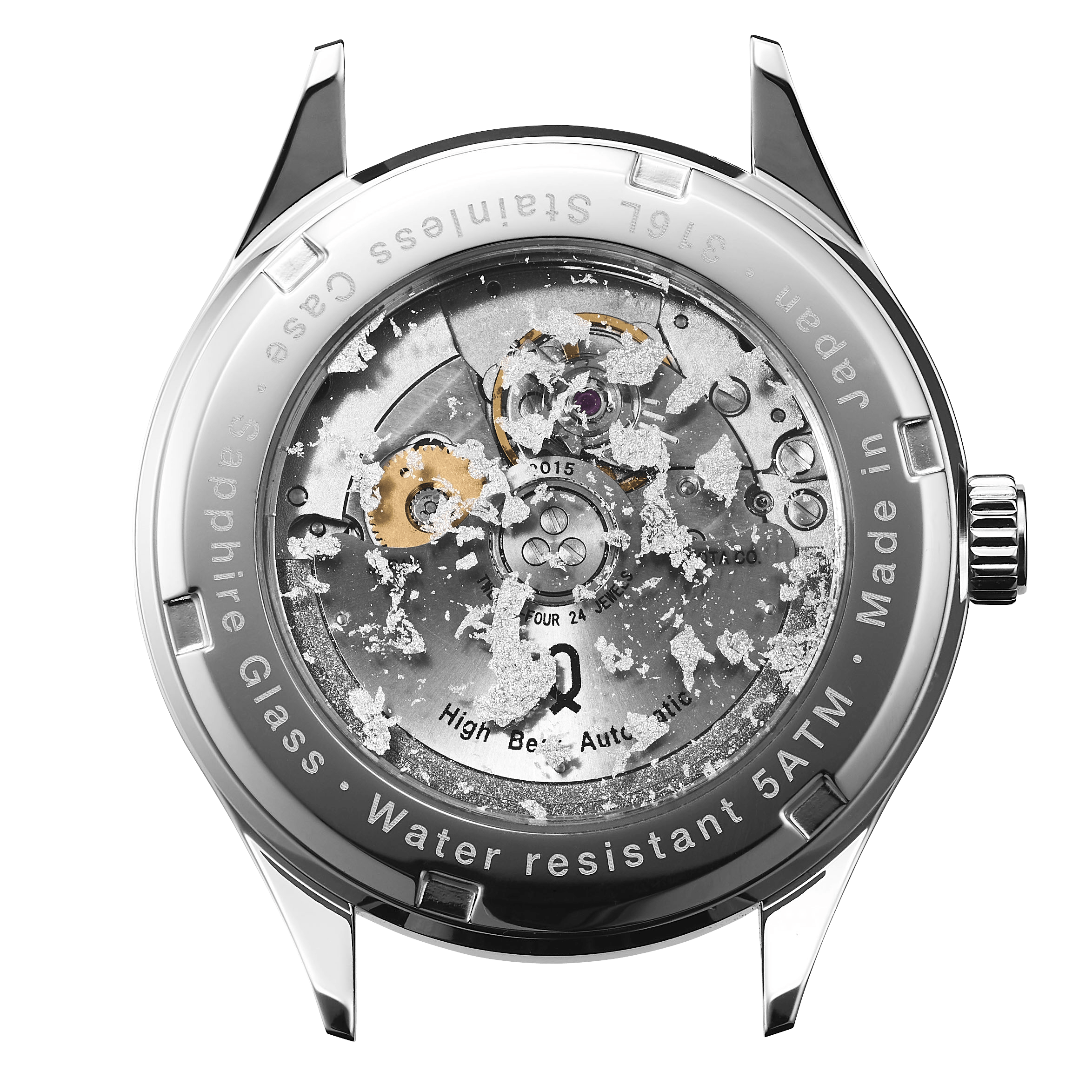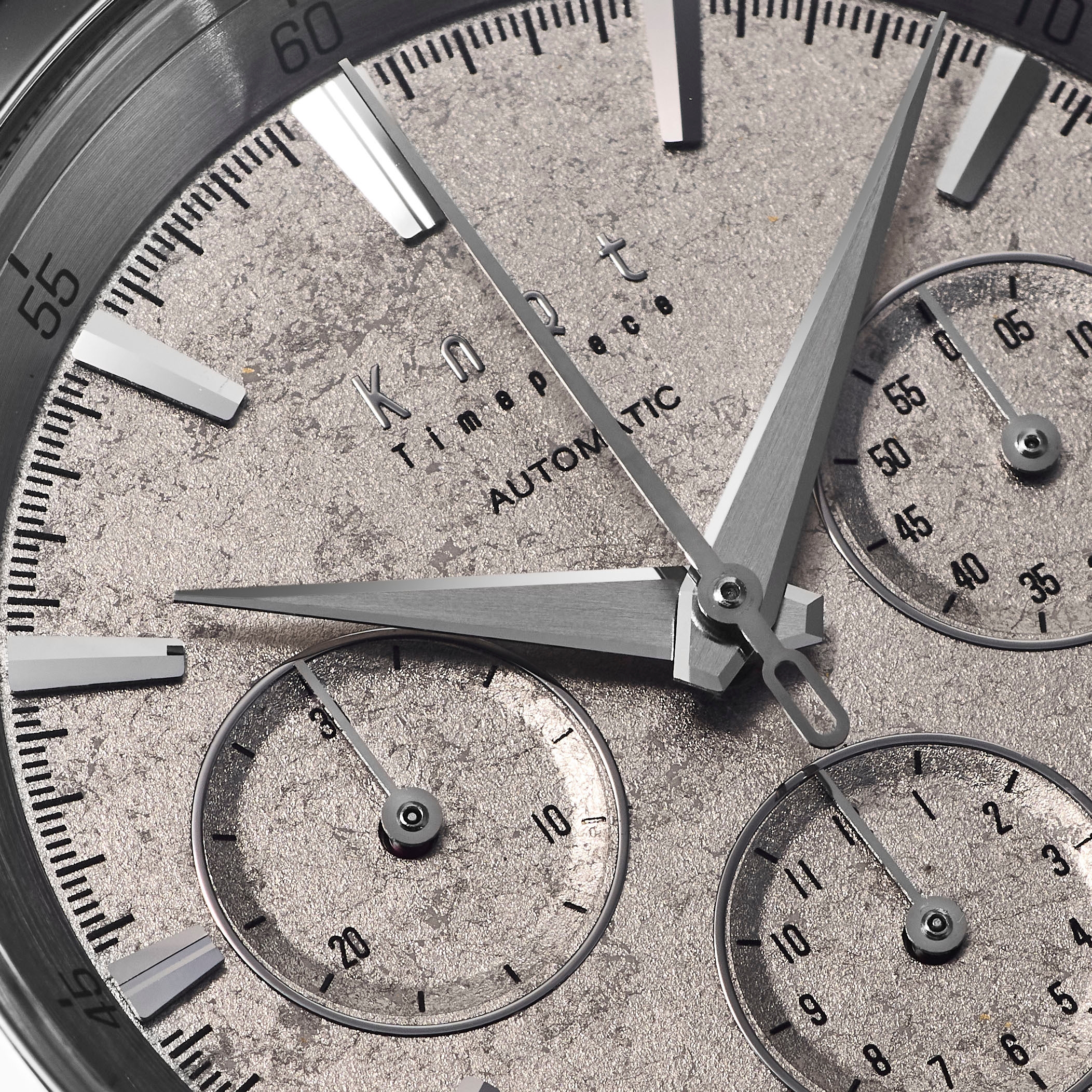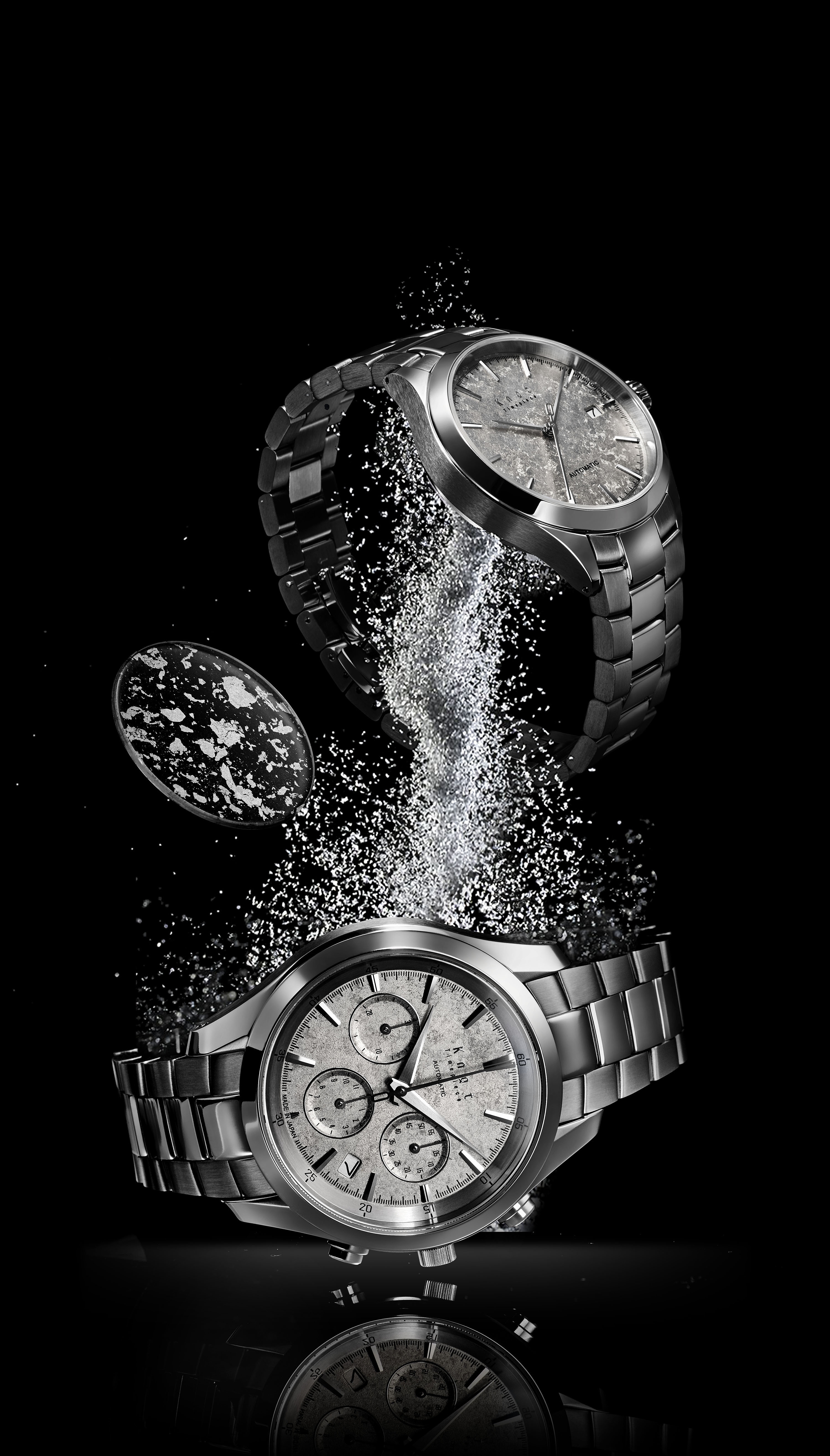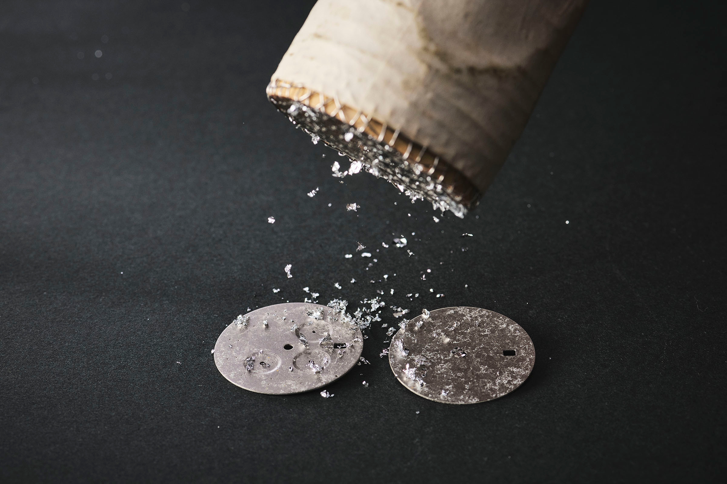 文字盤は一番目に触れる場所ですが、装飾が華美になると視認性が低下します。シンプルな意匠にしつつも素材の美しさを表現したい、というKnotのデザイナーと試行錯誤を繰り返し、最終的に採用となったのは「プラチナ箔」でした。プラチナ箔をフレーク状にした「切り廻し」を散りばめることで、箔の重なりが繊細な表情となって表現されています。また、ムーブメントの動きが見えるシースルーバックの三針タイプには、「散らし技法」が採用されています。こちらはサンプルを検討する段階で、箔一の実績であるゲラン社の香水ボトルやグラスウェア「Stardust」などにヒントを得てガラス素材との相性の良さが認められ採用となった技法です。