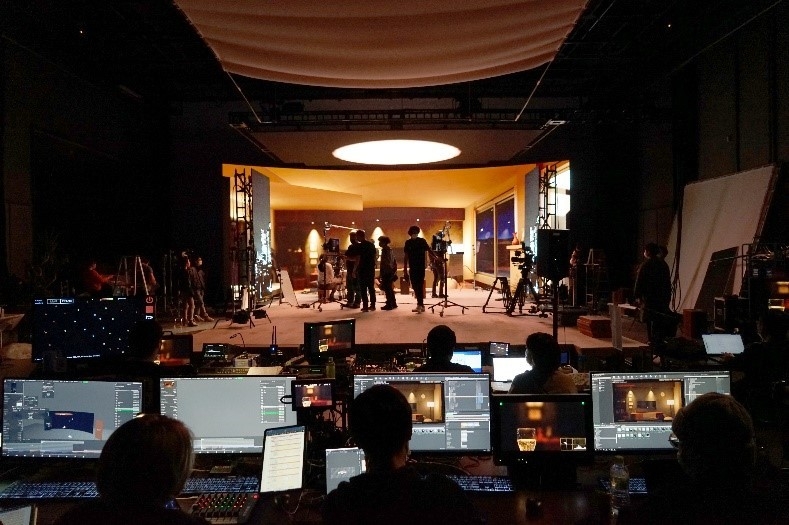 ※ 1LEDディスプレイ・システム、カメラトラッキング、リアルタイムレンダリングを組み合わせた撮影技法。高精細LEDディスプレイにCGで制作した情景(仮想世界)を映し、仮想世界と同期させたカメラで被写体と一緒に撮ることで、バーチャル空間の撮影をリアルタイムに実現可能。