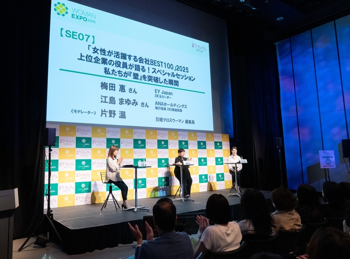この日最後となったセミナー「上位企業の役員が語る!スペシャルセッション 私たちが『壁』を突破した瞬間」には、日経ウーマンが実施した「女性が活躍する会社BEST100」上位企業のEY Japan DE&Iリーダーの梅田惠さん、ANAホールディングス 執行役員 DEI推進部長の江島まゆみさんが登壇。キャリアで直面した困難をどう乗り越えたかについて語り合いました。困難な環境に臆せず飛び込み、自分なりの強みを武器に働き方を切り拓いてきた2人の言葉は、多くの受講者の背中を押した様子でした。