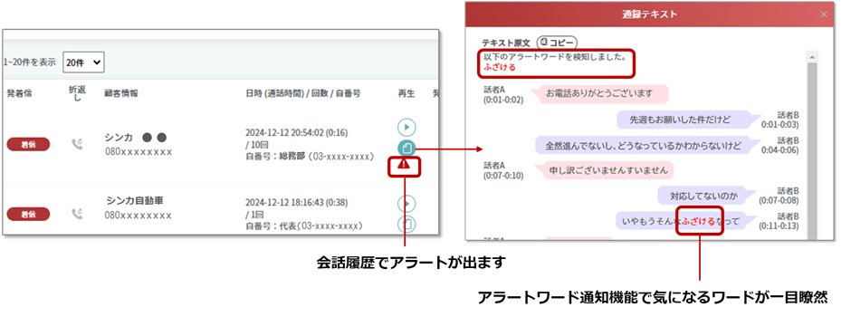 コミュニケーションプラットフォーム「カイクラ」を開発・販売する株式会社シンカ(本社:東京都千代田区、代表取締役社長 江尻 高宏、証券コード:149A、以下「シンカ」)は、「カイクラ」のアラートワード通知機能を通じて、顧客対応業務におけるカスタマーハラスメント(以下、カスハラ)対策を支援しています。この機能は、通話データに設定したカスハラでよく利用されるキーワードが含まれている場合、会話履歴にアラートを表示し、会社として迅速な対応を可能にすることで従業員のストレスを軽減しながら、顧客対応の品質向上に貢献します。