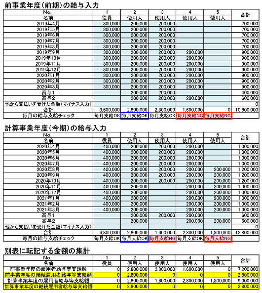 継続雇用者給与等支給額に該当するのはNo.2への支給額のみとなり、継続雇用者給与等支給額が前期に比べて1.5%増加していないため、適用要件を満たすことができませんでした。