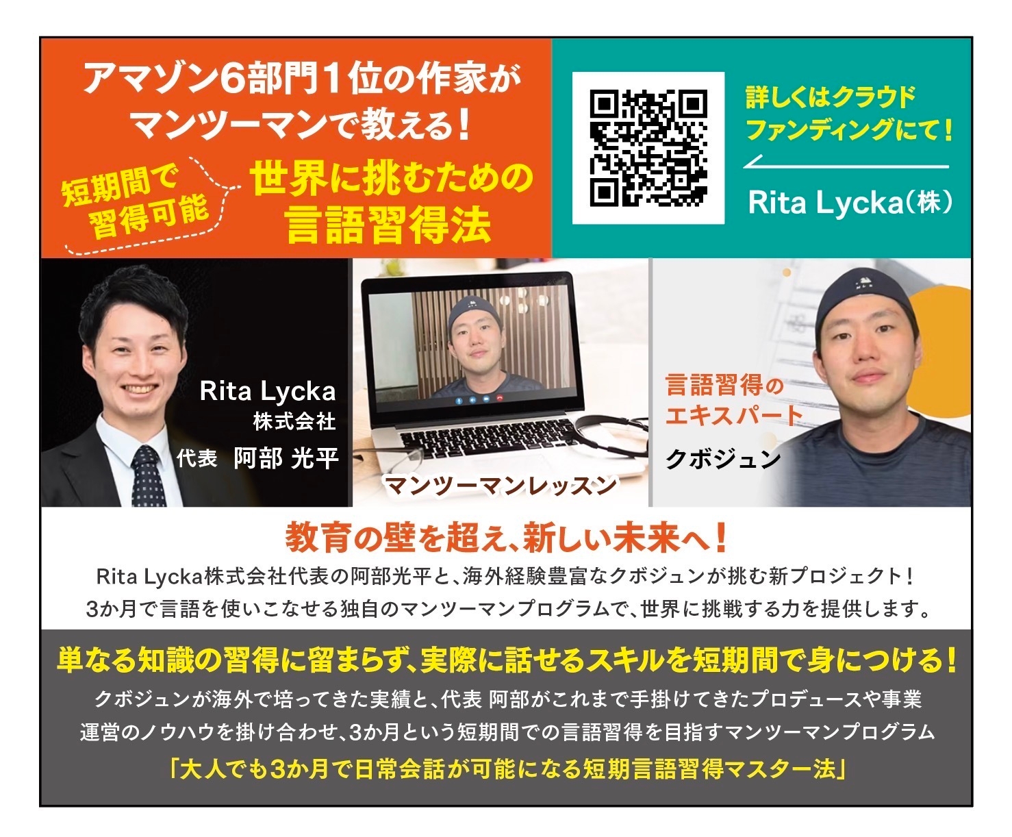 教育・学習支援事業を行うRita Lycka株式会社(所在地:東京都墨田区、代表:阿部 光平)は、クラウドファンディングサイト「CAMPFIRE」にて「アマゾン6部門1位の作家がマンツーマンで教える言語習得を広めたい!」のプロジェクトが目標金額175%を達成しました。