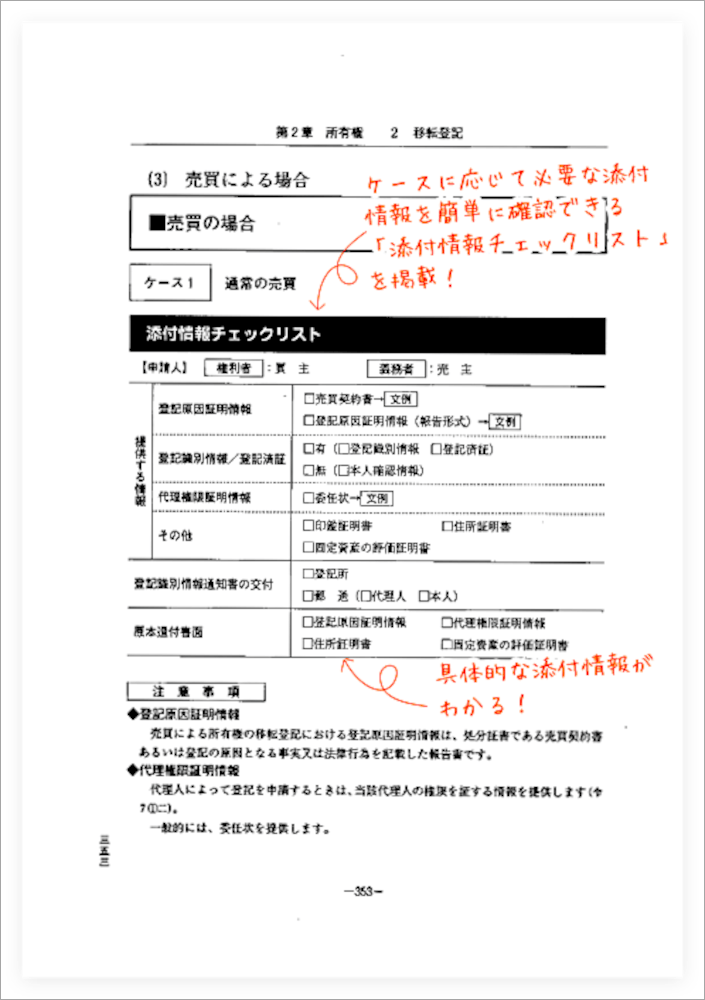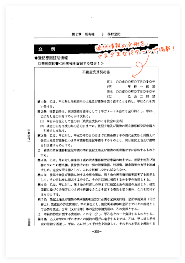 不動産登記のケースごとに添付情報の文例を数多く収載していますので、登記申請を正確かつ迅速に行うことができます。