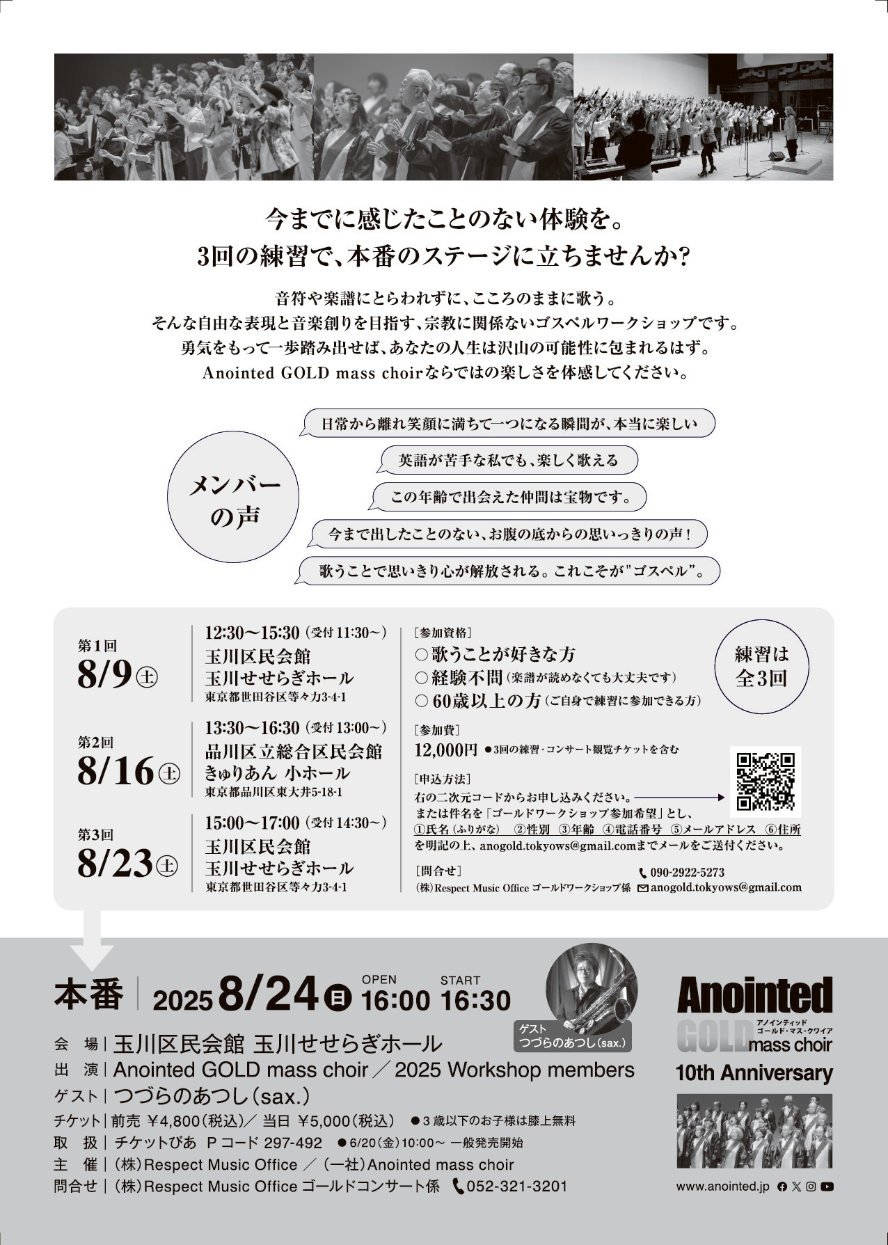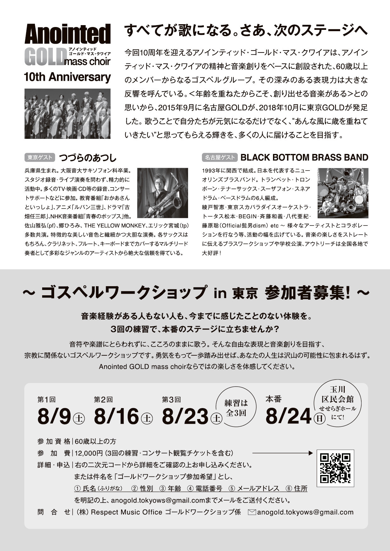 東京の記念コンサートでは、サックス奏者 つづらのあつし をゲストに迎え、大人のゴスペルでコンサートを演出する他、3回の練習を経て本番のコンサートに出演する参加型企画『ゴスペルワークショップ』も同時開催。