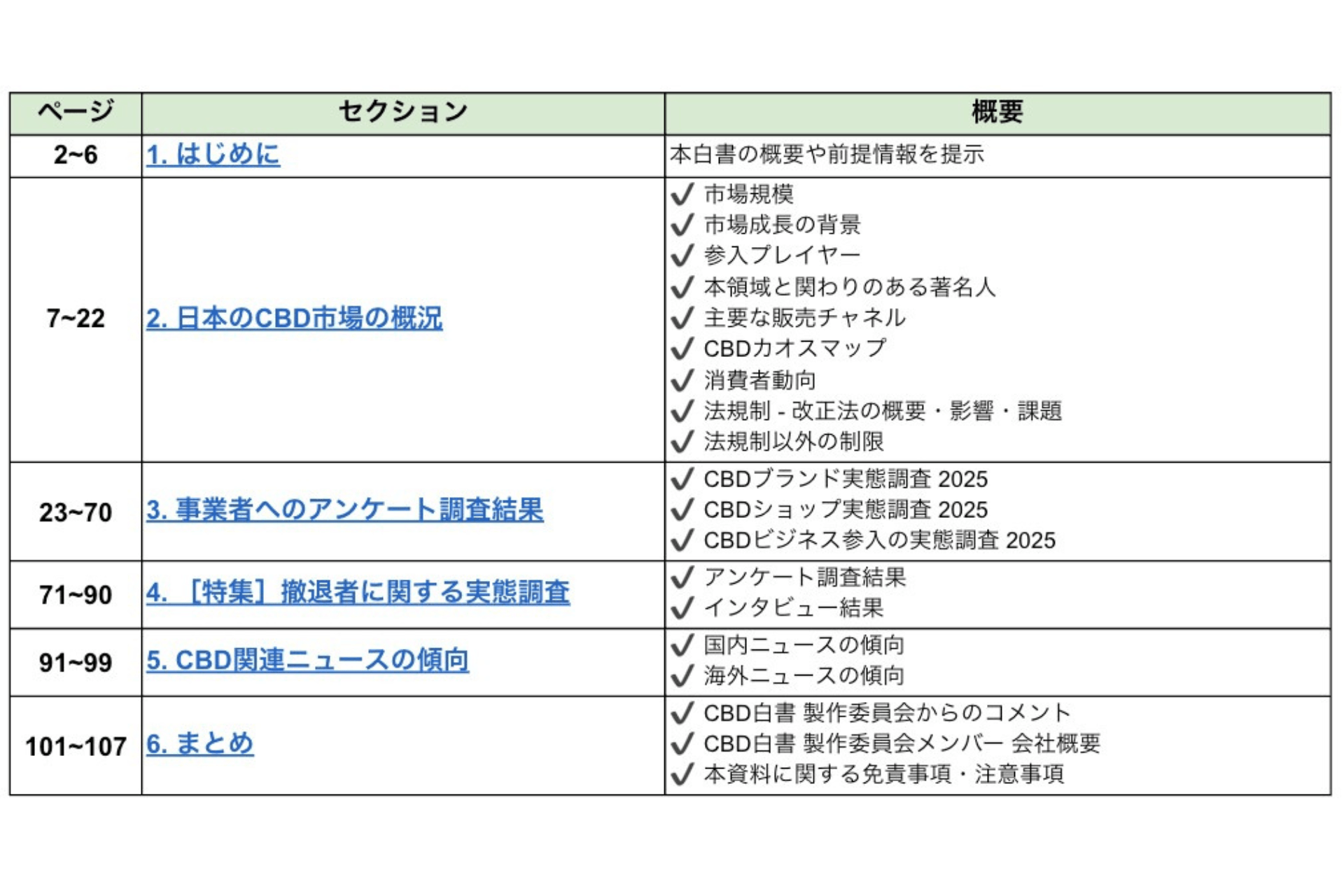 『CBD白書2025』は、法改正前後の各プレイヤーの事業動向、新規参入・撤退事業者の動向、国内外の関連ニュースの傾向という3つの視点から“CBDの現在地”を再構成した資料です。