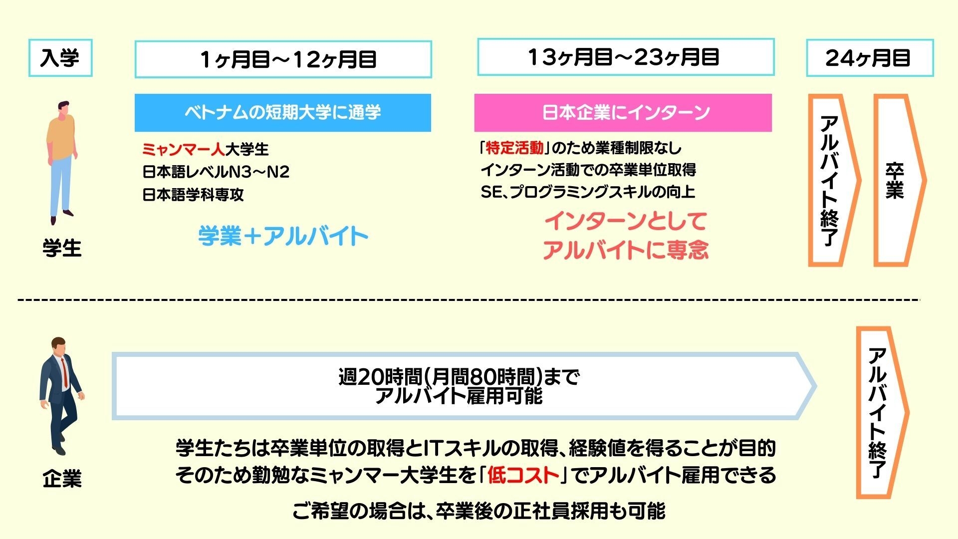 本サービスはベトナムの短期大学へ留学しているミャンマー国籍の大学生を2年間、受入企業様で専属アルバイトとして雇用できるというものです。この学生たちは合格率15%以下のミャンマーの大学に合格し、英語、日本語を中心に多言語を扱うことができます。本サービスの学生たちはエンジニアを志しており、アルバイトを通じて自身のエンジニアスキルの向上を目的としています。在学中は日本語学科の専攻と並行し、「週20時間(月80時間)」までアルバイトとして最大2年間にわたり業務に従事が可能となっております。