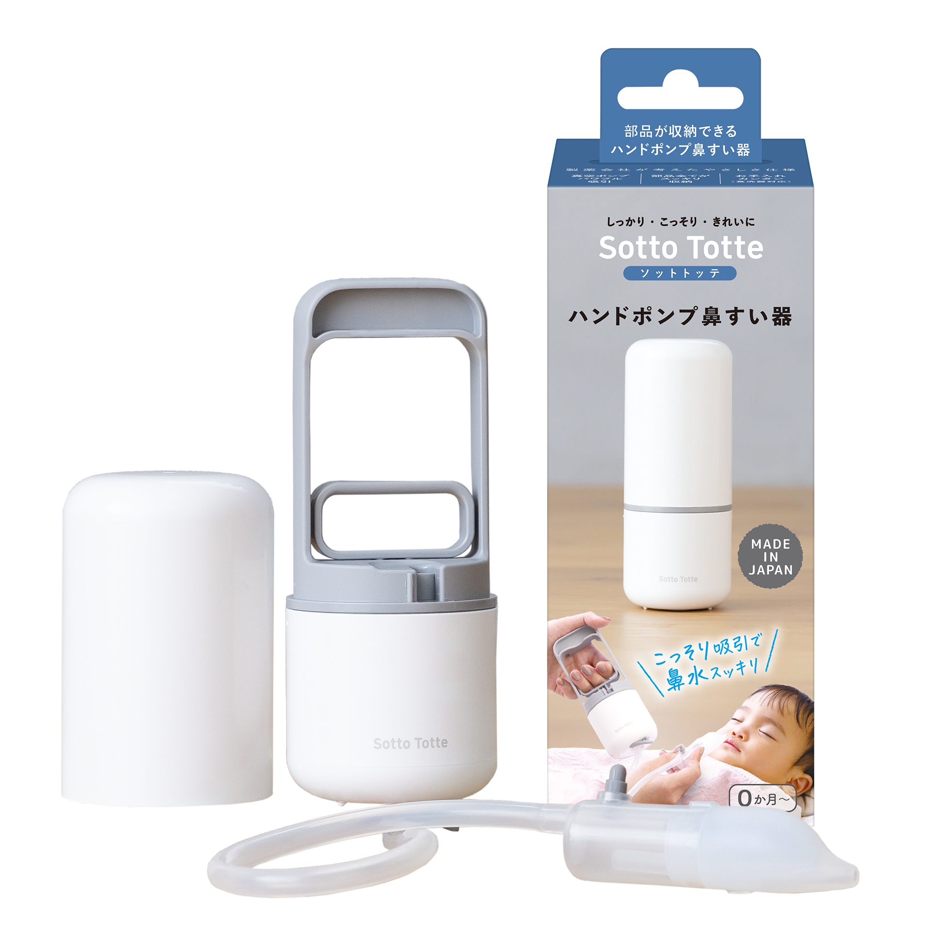 『ソットトッテ ハンドポンプ鼻すい器』は、真空ポンプ構造でしっかり鼻水が吸引できるのに、赤ちゃんが嫌がる動作音がない、静音性にこだわったハンドポンプタイプの鼻すい器です。全ての部品が収納でき、いつでもどこででも使用できる他、スタイリッシュなデザインでお部屋に置いてもインテリアに自然になじみます。