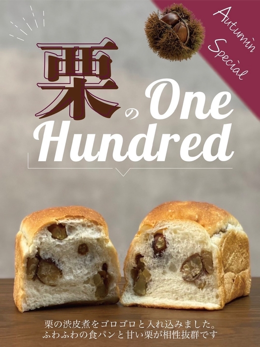 圧倒的な柔らかさを誇る世界初の食パン“100 One Hundred”に、栗の甘露煮を中にたっぷりと詰め込み、ふわふわと柔らかい食パンとほっこり香ばしい栗の甘みが特徴です。