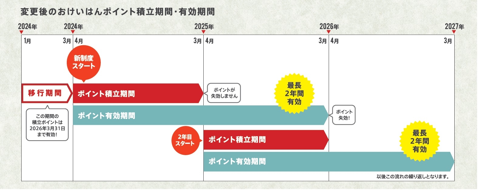 ※ なお、移行期間である2024年1月1日から3月31日までに貯めたポイントは、特別措置として、2024年度(4月1日~翌年3月31日)の積立ポイントと合算して2026年3月31日まで有効といたします。また、有効期間の延長に伴い、2025年4月1日時点ではおけいはんポイントは失効いたしません。これに伴うお客さま側でのお手続きはございません。