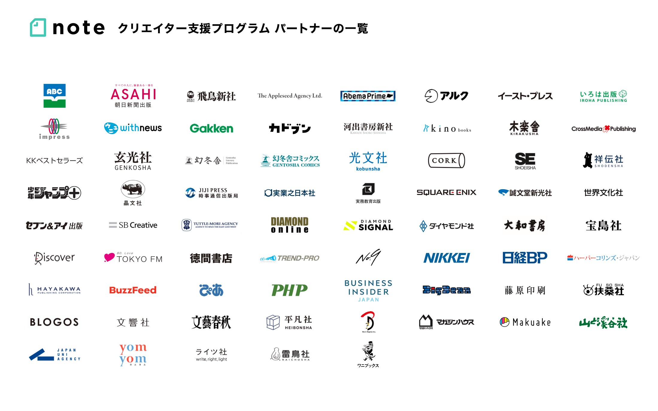noteクリエイターが活躍する場を広げるために、noteが出版社やメディア、クリエイターエージェンシーなどのメディアパートナーとともに才能の開花を後押しするプログラムです。