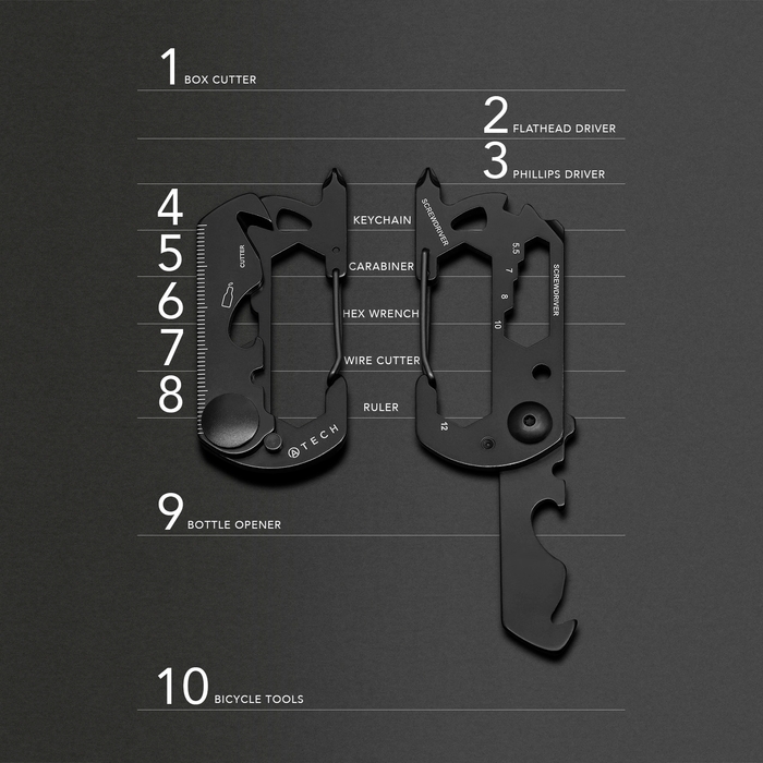 携帯するのに便利なマルチツールが、10の機能のカラビナと8つの機能のキーチェーンタイプの2種類が新発売致します。男心をくすぐるマットブラックの仕上がりと機能が盛りだくさんな便利ツールはギフトにも喜ばれると思います。