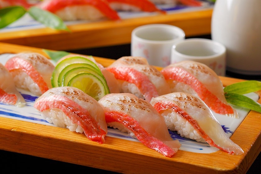 左)炙ることで上質な脂の甘みも楽しめる金目鯛の炙り寿司。凝縮された旨みを存分にお楽しみください。
