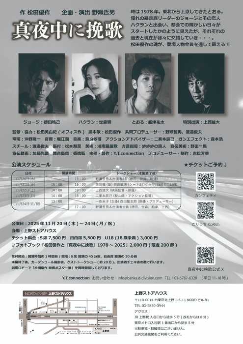 松田優作氏が作・演出を手掛けた最後の舞台『真夜中に挽歌』が2025年11月20日 (木) 〜 2025年11月24日 (月・祝)に上野ストアハウス(東京都 台東区 北上野 1-6-11)にて上演されます。