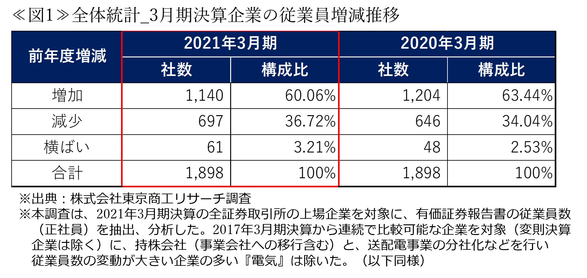≪図1≫は、株式会社東京商工リサーチより開示された3月期決算の上場企業1,898社の従業員増減の推移を示した表である。これによると、2020年3月期から2021年3月期にかけて従業員数が減少した企業の割合が増加(34.04%→36.72%)していることがわかる。