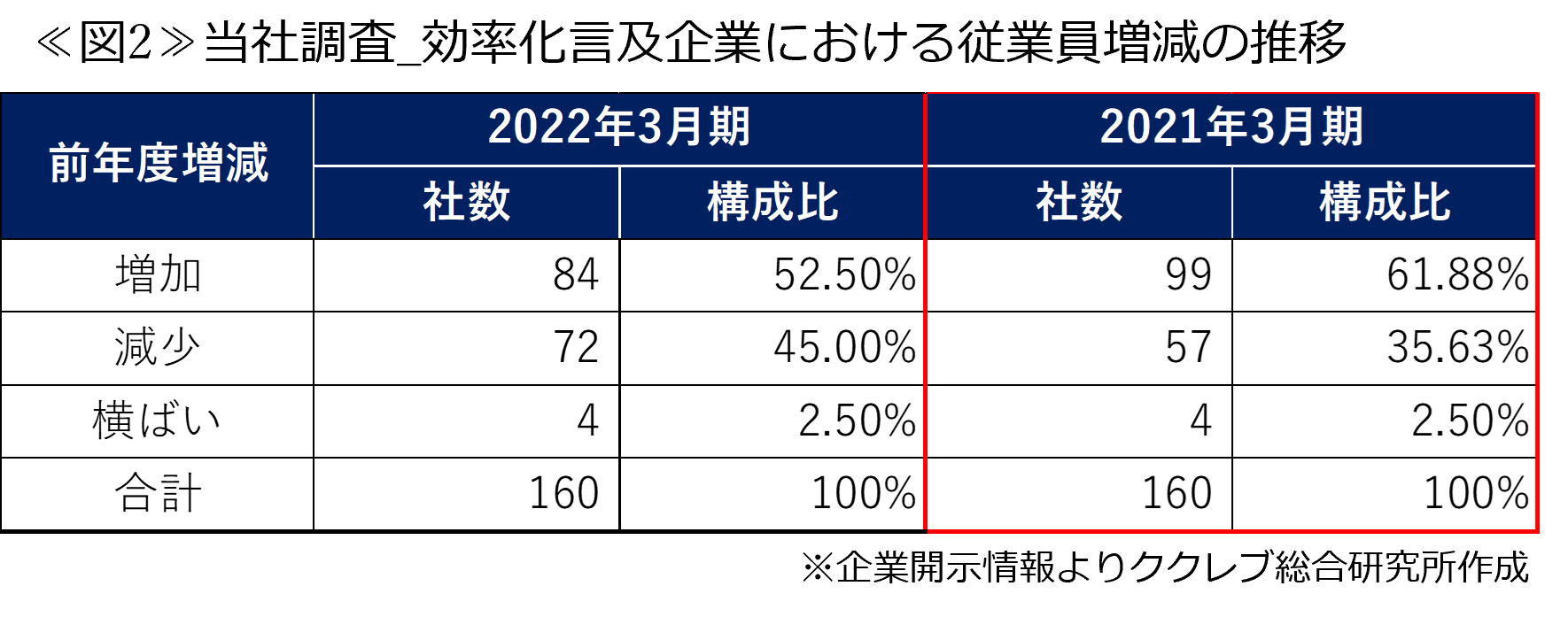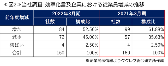 これによると、抽出された全160社の2021年3月期における従業員数については、効率化言及企業においても、従業員が減少している企業の割合は35.63%と全体統計の36.72%と大きく変わらず、2021年3月期においては、従業員減少の割合の差異を明確に確認することはできなかった。