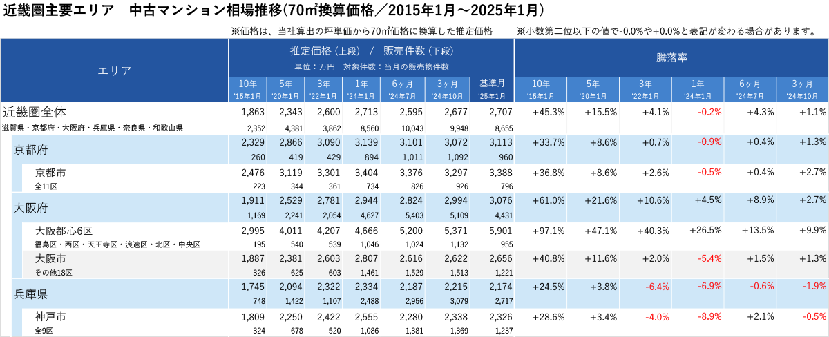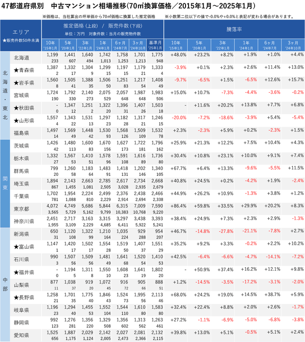 「不動産×WEB×ビッグデータ」の領域で、さまざまな不動産テックサービスを展開する株式会社ワンノブアカインド(本社:東京都港区、代表取締役社長:川島 直也、以下当社)は、当社が運営しているマンション情報サイト「マンションレビュー」の保有データを元に、全国の2025年1月の中古マンション相場を調査。坪単価をベースに70㎡での価格に換算した「中古マンション価格」*1について、10年前・5年前・3年前・前年からの推移を都道府県別・エリアごとにまとめましたので、発表いたします。