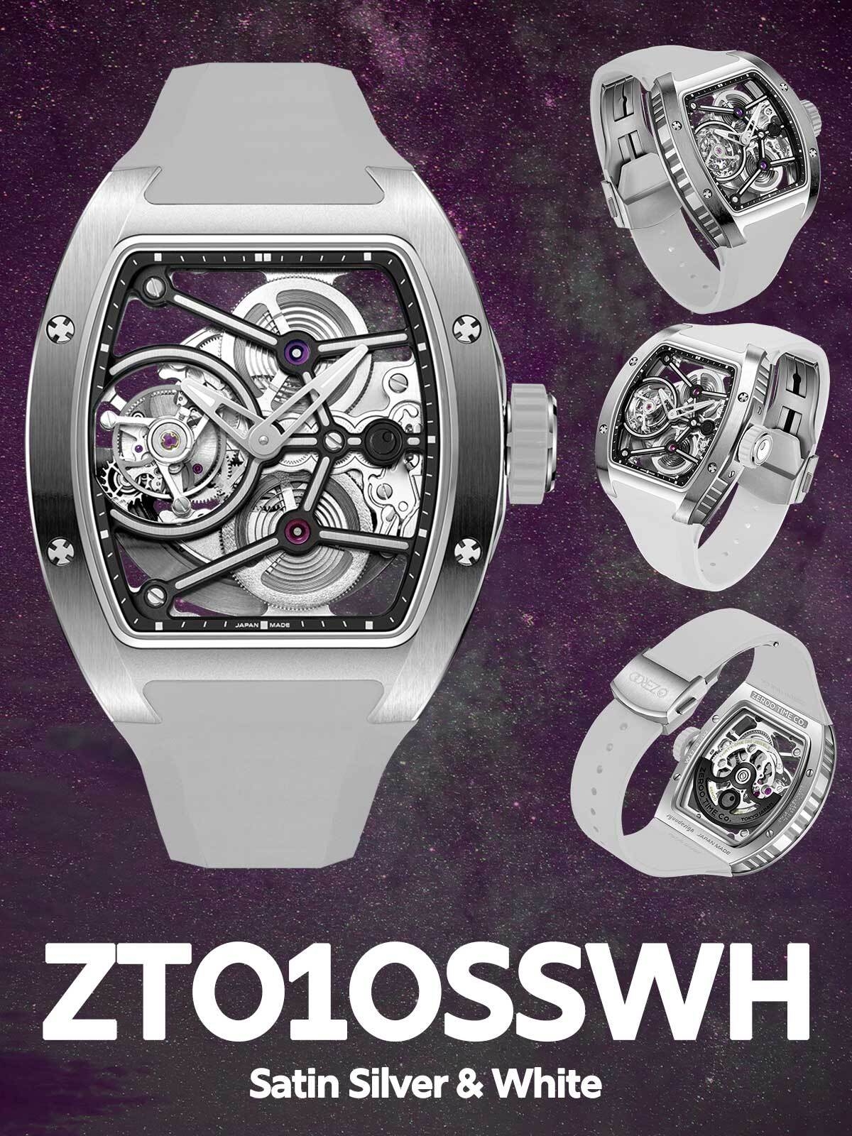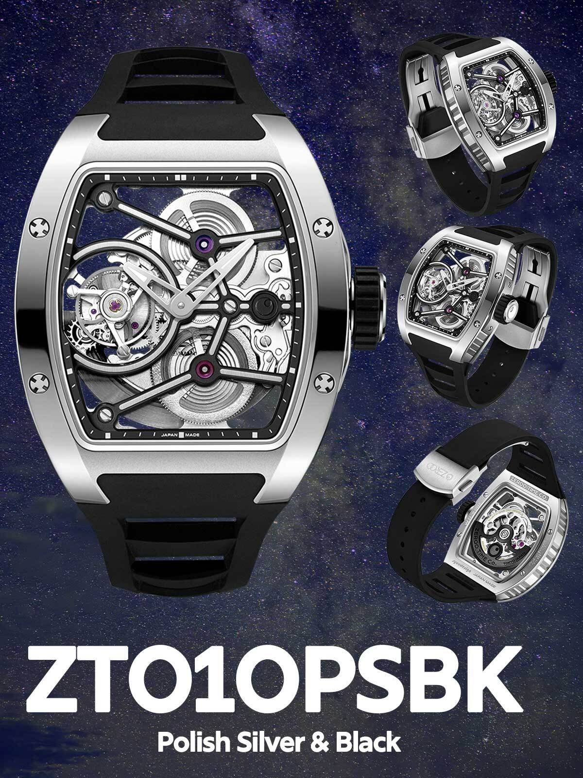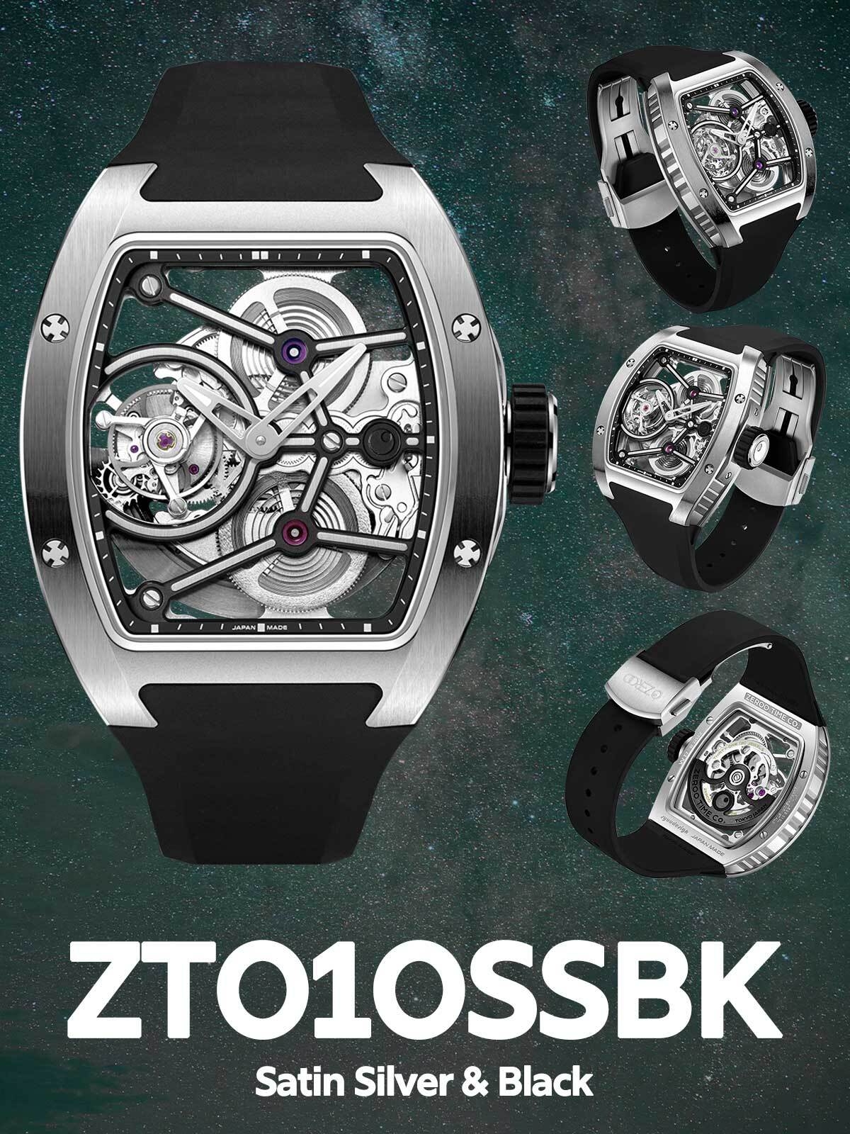 T10は、全世界で高評価を得た手巻式T4の哲学を継承しながら、新開発Cal.ZT08自動巻ムーブメントを搭載。約60時間のパワーリザーブを実現し、利便性と機構美を両立しています。ケースはT10のために新規開発したトノー型オリジナルデザインで、立体フィン形状の側面、サファイアクリスタル風防、裏蓋スケルトン構造により、ローターやトゥールビヨンの動きを前後両面から鑑賞可能です。