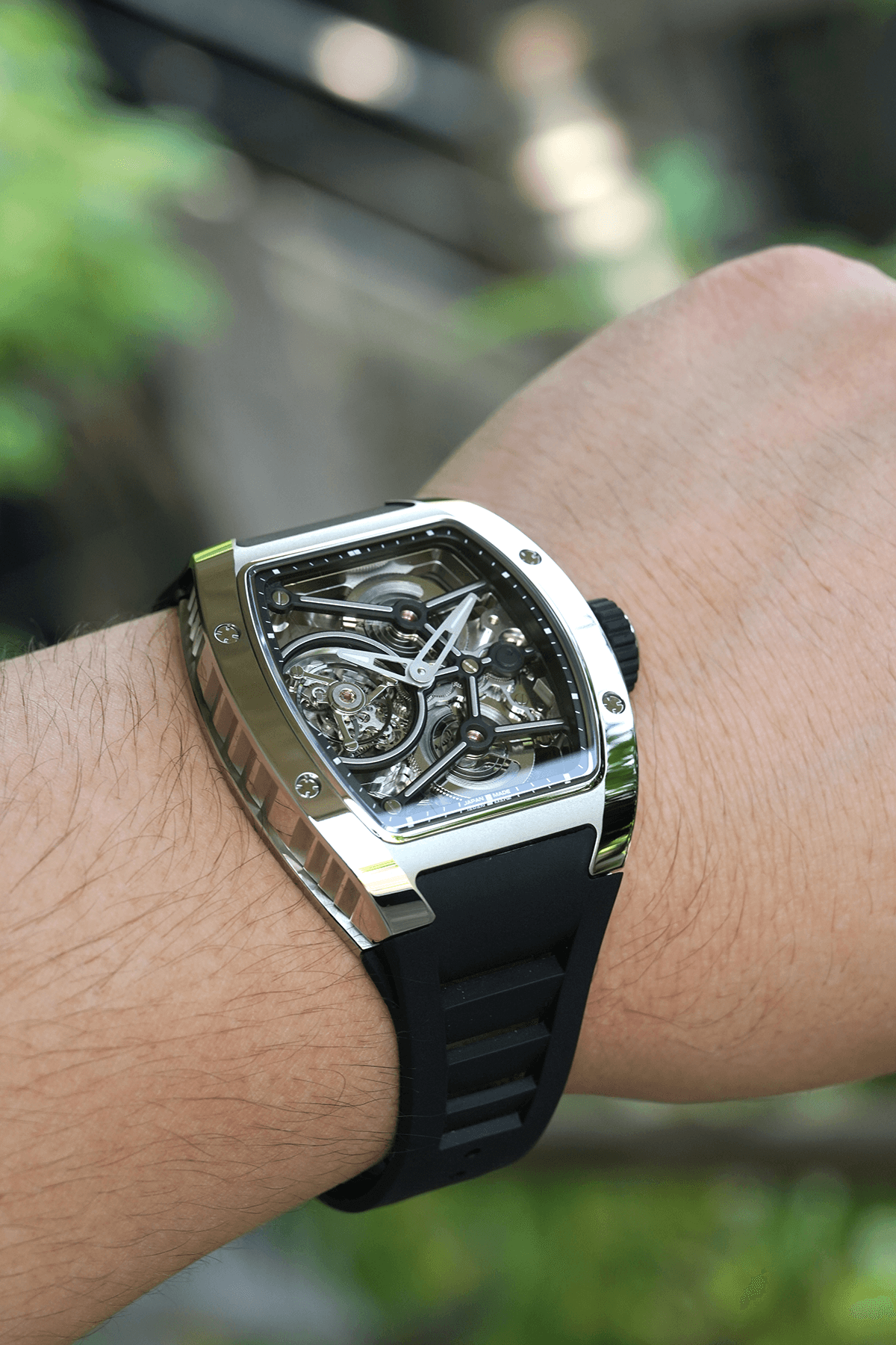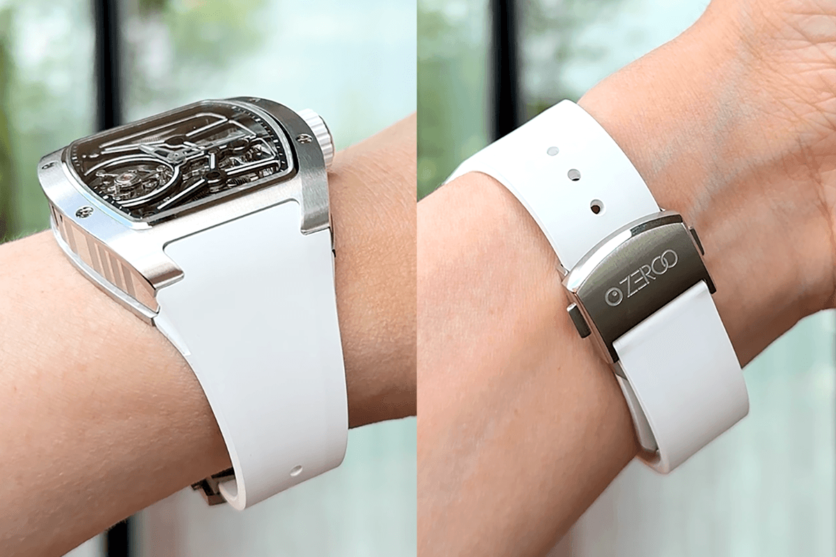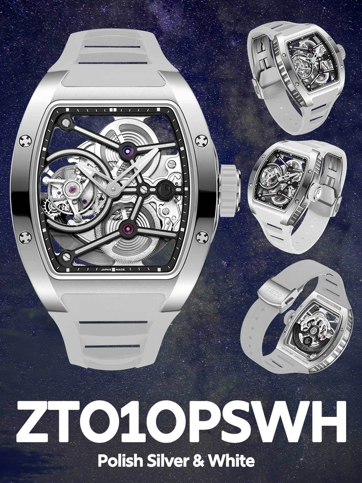 T10は、全世界で高評価を得た手巻式T4の哲学を継承しながら、新開発Cal.ZT08自動巻ムーブメントを搭載。約60時間のパワーリザーブを実現し、利便性と機構美を両立しています。ケースはT10のために新規開発したトノー型オリジナルデザインで、立体フィン形状の側面、サファイアクリスタル風防、裏蓋スケルトン構造により、ローターやトゥールビヨンの動きを前後両面から鑑賞可能です。
