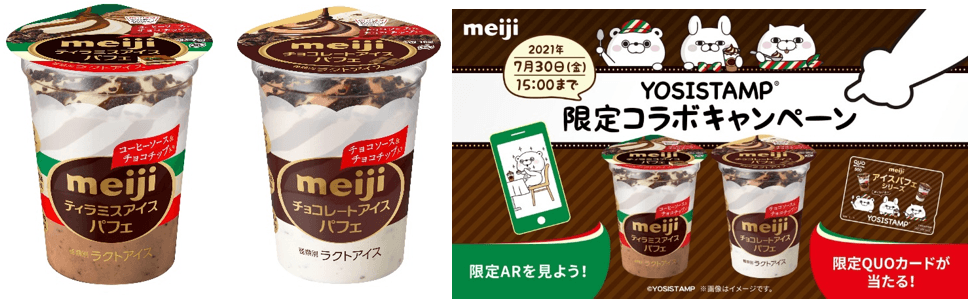 本キャンペーンでは、2021年3月22日(月)より、全国販売したアイスパフェシリーズの新フレーバー「明治 ティラミスアイス パフェ」と「明治 チョコレートアイス パフェ」が、「うさぎ100%」をはじめとしたコミカルな表情のキャラクターが人気の「ヨッシースタンプ」とコラボ。対象商品をご購入いただき、専用アプリでスキャンすると、「ヨッシースタンプ」の世界観満載な限定コラボARをお楽しみいただけます。また、本コラボを記念して発売される「明治 ティラミスアイス パフェ」の「ヨッシースタンプ 限定コラボキャンペーン」パッケージを購入すると、「ヨッシースタンプ 限定コラボQUOカード」が合計500名様に当たるプレゼントキャンペーンも実施いたします。